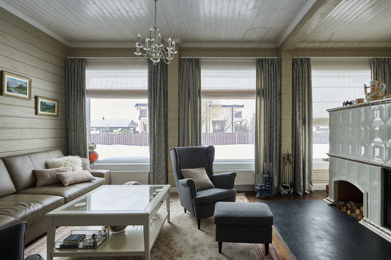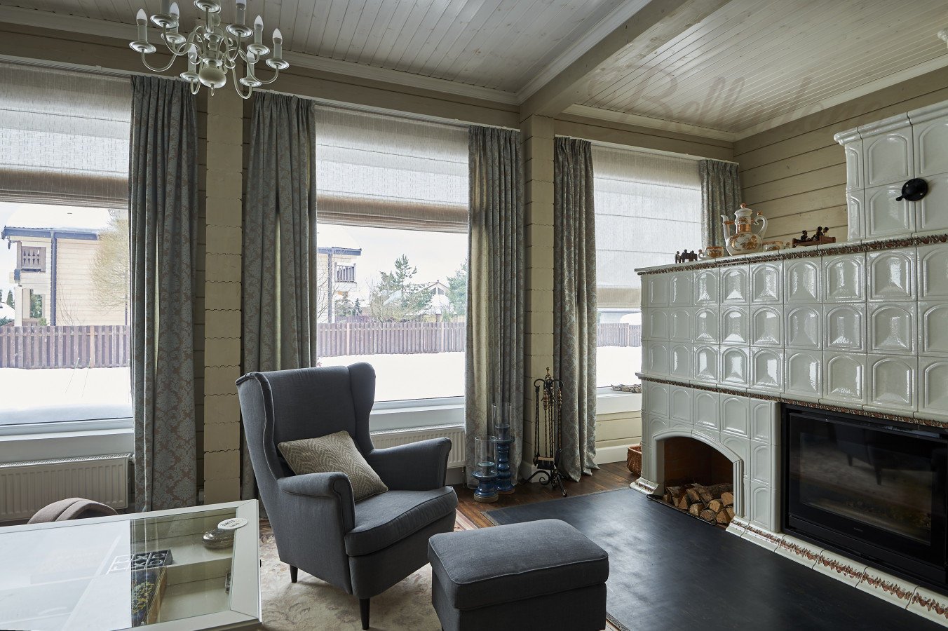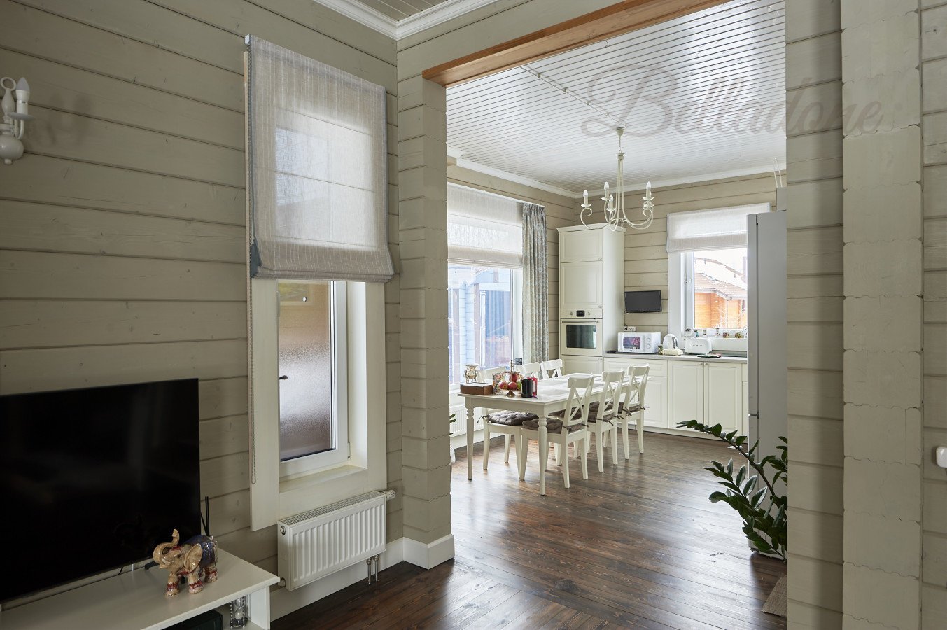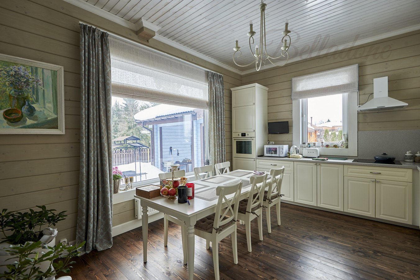 Оформление 1 этажа коттеджа из бруса шторами, КП "Руза Фэмели Парк"
